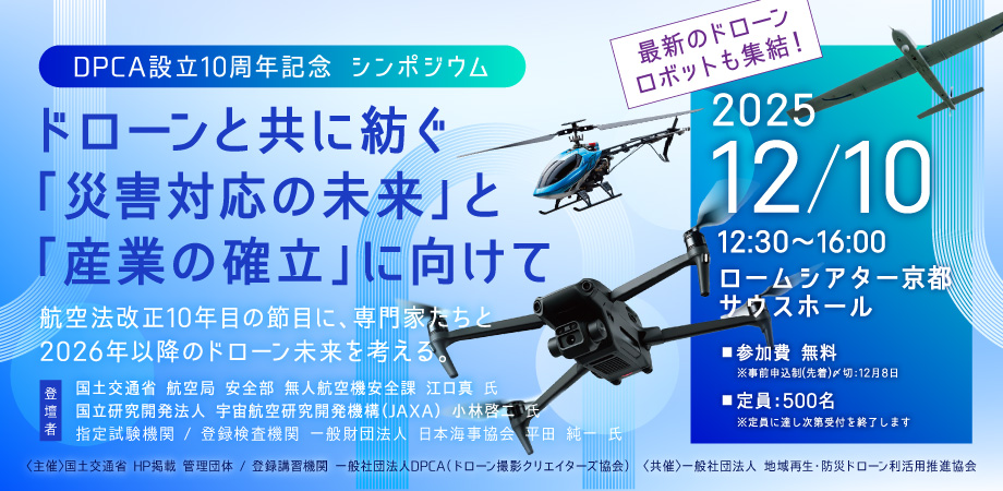 ドローンユーザー必見!! 航空局・JAXA・日本海事協会の登壇決定!DPCA設立10周年記念シンポジウム 12月10日(水)ロームシアター京都で開催!